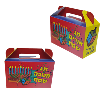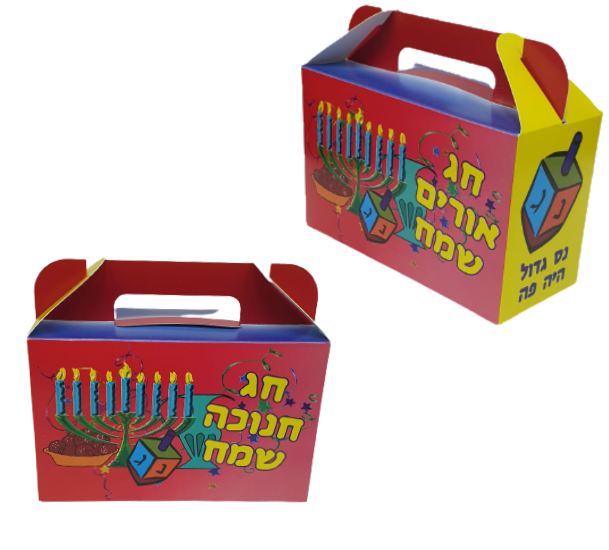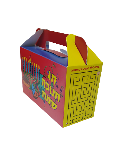קופסת קרטון למילוי מתנות וממתקים לחג החנוכה.