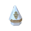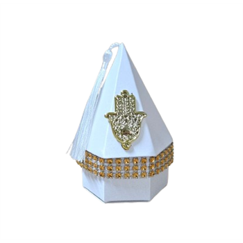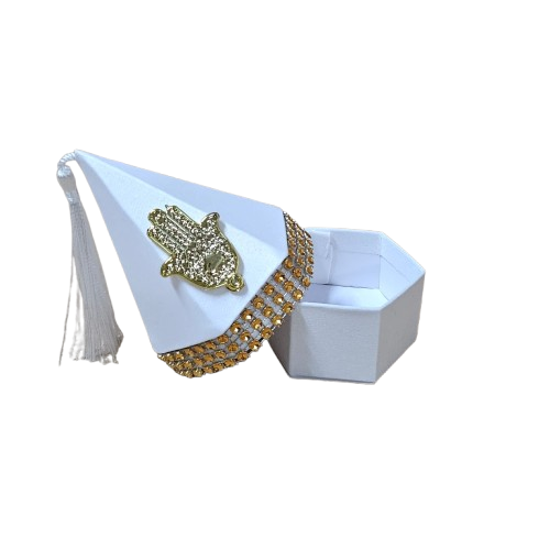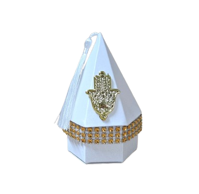 טאג׳ין מהודר לעיצוב שולחן ודוקרציה באירועי חינה. צבע לבן עם עיטור חמסה מוזהבת.