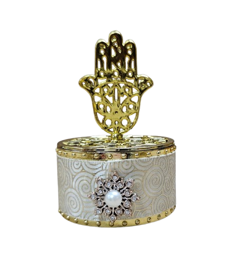קופסא יוקרתית עם קישוט פנינה בשילוב בד ומכסה חמסה מאוורר. מושלמת לחינה, עיצוב שולחן, מתנה ומזכרת לאורחים. מידות: קוטר 5.5 ס"מ | גובה 9 ס"מ מגיע ארוז 12 יח' בחבילה