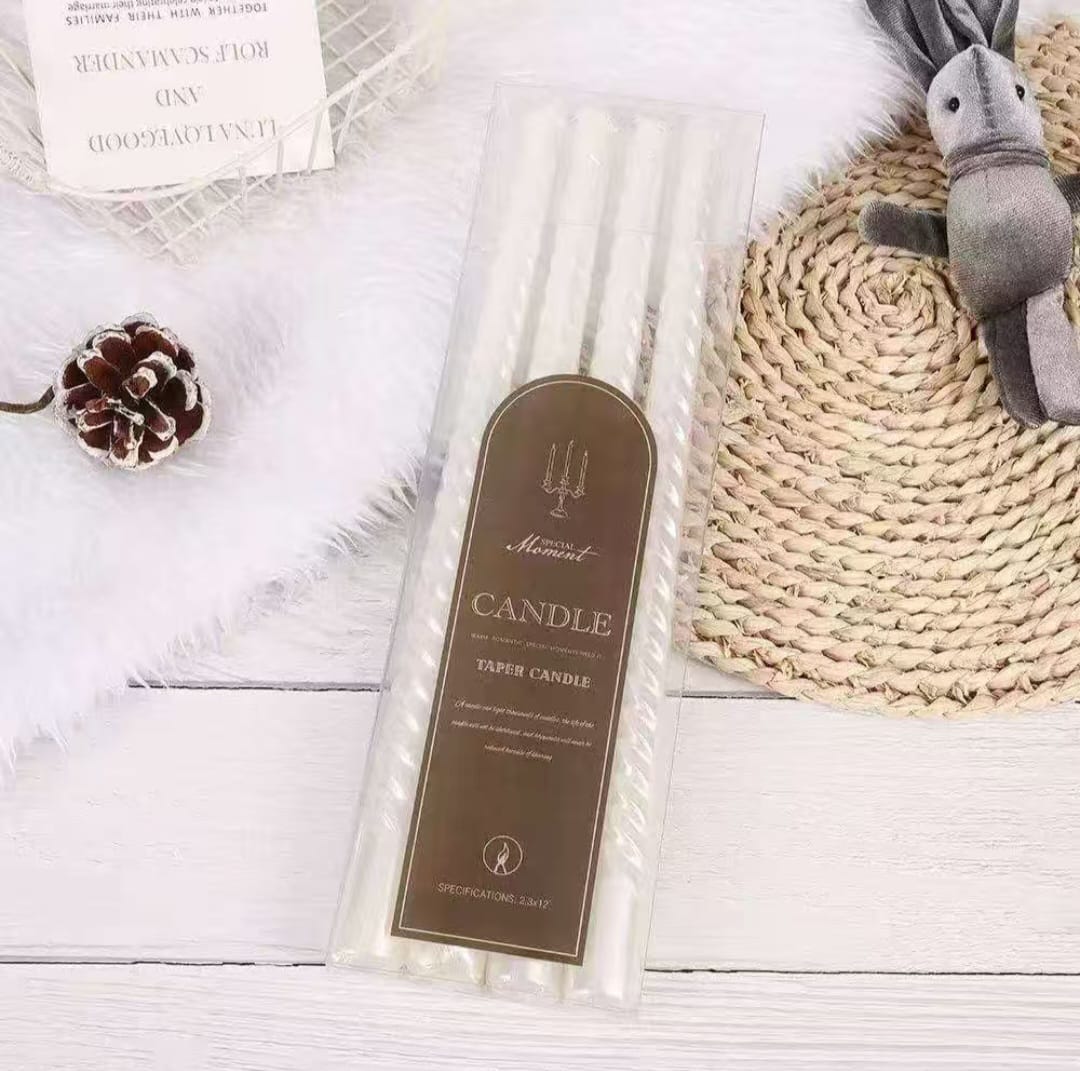 רביעיית נרות מסולסלים ואיכותיים באורך 30 ס"מ, המיועדים לטקס חינה ולעיצוב שולחן חגיגי. הנרות מתאימים במיוחד לקישוט קערת החינה, ומוסיפים מראה אלגנטי, מסורתי ומרשים לאירוע. צבע: לבן | אורך: 30 ס"מ | כמות במארז: 4 נרות