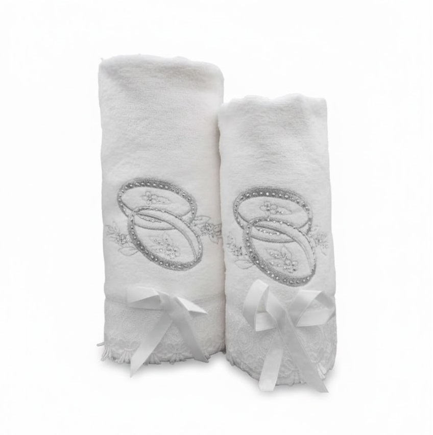 מגבות עם סיומת תחרה ורקמת טבעות נישואין בצבע כסף דגם סברובסקי .