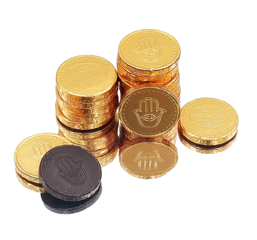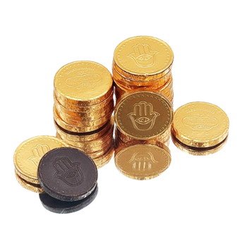 מטבעות שוקולד תוצרת איטליה עם הטבעת חמסה, עטיפת זהובה. כשר פרווה בד"ץ בית יוסף.