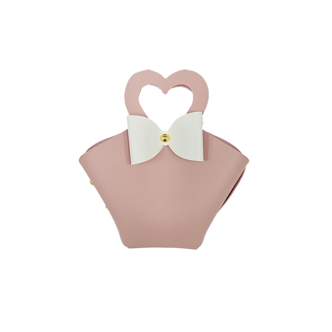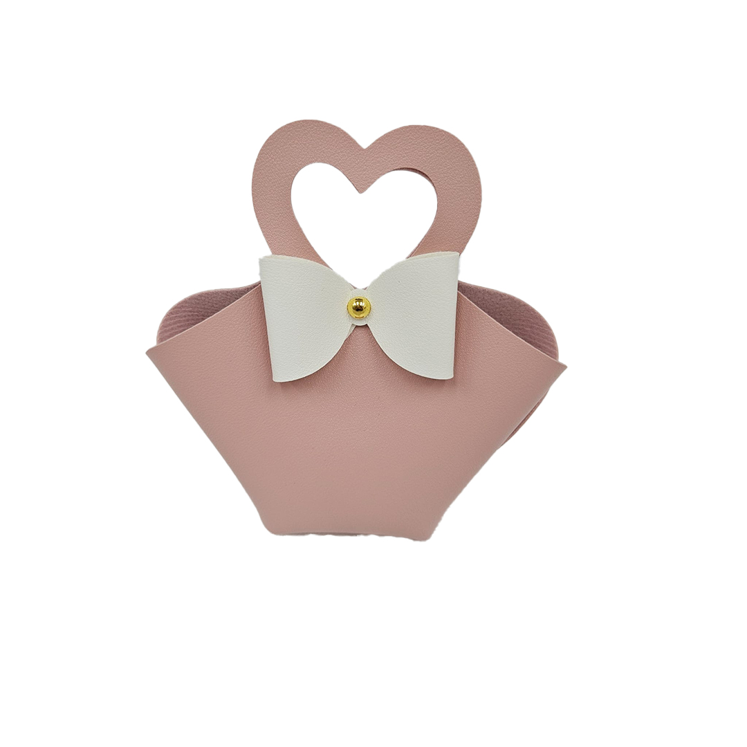 מיני תיק בקישוט פפיון דמוי עור למתנות לאורחים / מזכרות לאורחים באירועים. נמכר במארז המכיל 10 יחידות. צבע: ורוד עם פפיון לבן | מידות: 6X5X16 ס"מ