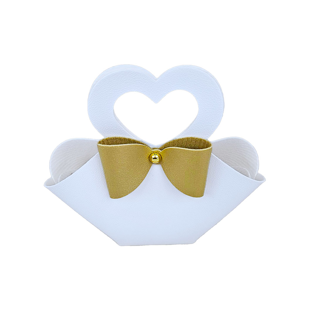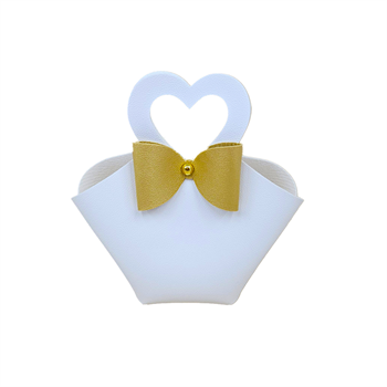 מיני תיק בקישוט פפיון דמוי עור למתנות לאורחים / מזכרות לאורחים באירועים. נמכר במארז המכיל 10 יחידות. צבע: אדום עם פפיון זהב | מידות: 6X5X16 ס"מ