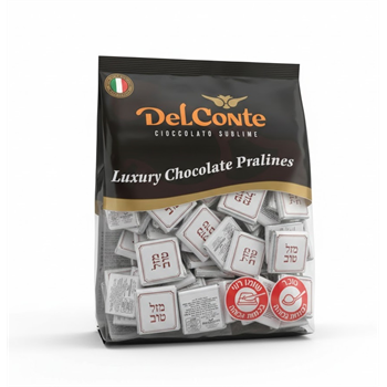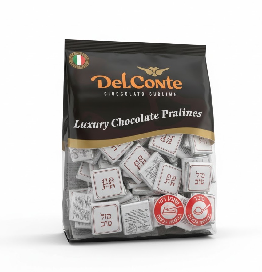 שוקולד נפוליטן עטוף כסוף-לבן עם כיתוב אדום "מזל טוב" מריר פרווה בד"צ. כשל"פ תוצרת דלקונטה