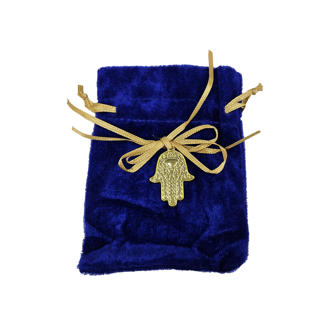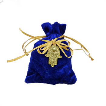 שקית קטיפה מקושטת בתליון חמסה עם סרט סאטן לחלוקה לאורחים למזכרת מהאירוע. פריט ייחודי לאריזול. נמכר במארז 10 יחידות מידות: 9X13 ס"מ | צבע: כחול עם חמסה זהב