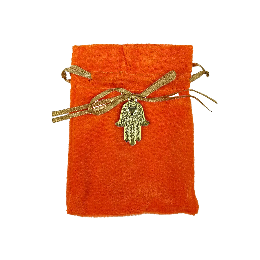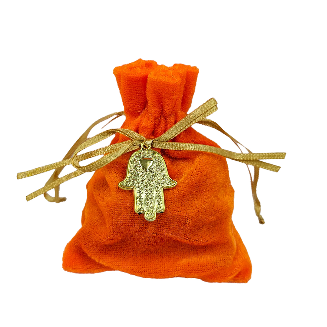 שקית קטיפה מקושטת בתליון חמסה עם סרט סאטן לחלוקה לאורחים למזכרת מהאירוע. פריט ייחודי לאריזול. נמכר במארז 10 יחידות מידות: 9X13 ס"מ | צבע: כתום עם חמסה זהב