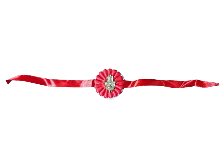 כרית הנצמדת ליד לעריכת טקס החינה. עיטור פרח וסרט סאטן בצבע אדום לקשירת הכרית על היד.