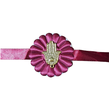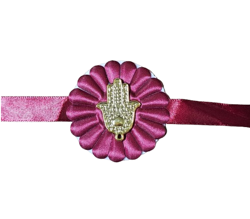כרית הנצמדת ליד לעריכת טקס החינה. עיטור חמסה מפלסטיק בצבע זהב עם סרט סאטן לקשירת הכרית על היד.