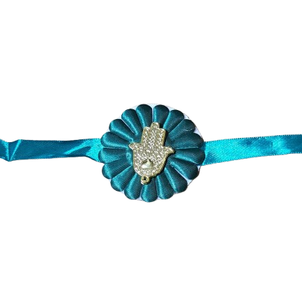 כרית הנצמדת ליד לעריכת טקס החינה. עיטור חמסה מפלסטיק בצבע זהב עם סרט סאטן לקשירת הכרית על היד.