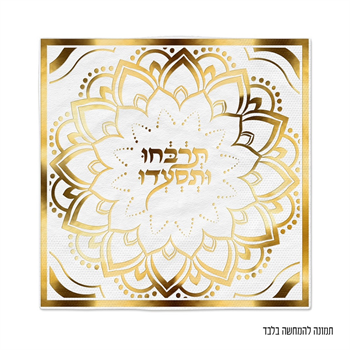 מפיות נייר לבנות עם עיטור מוזהב וכיתוב תרבחו ותסעדו - לעיצוב שולחן מימונה או חינה.