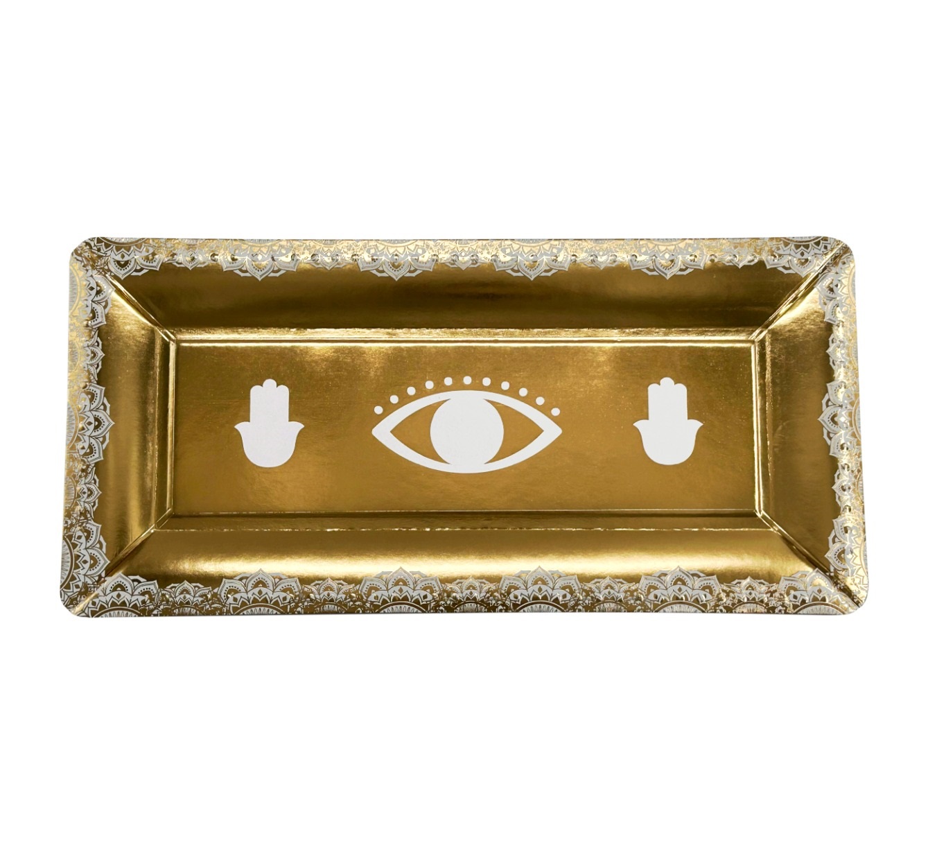 מארז 3 מגשים בגודל המתאים לעוגת אינגליש (כמו תבניות אינגליש). צבע זהב מלכותי עם הדפס חמסות ועין באמצע, לחינה או מימונה.